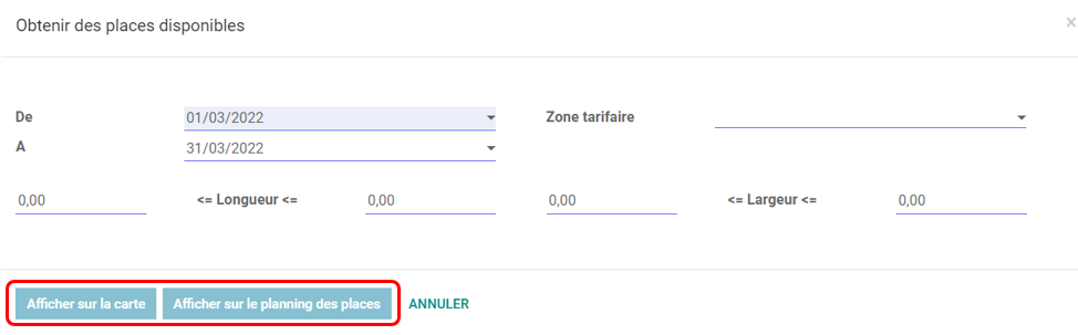 Entrer les informations, puis cliquer sur Afficher sur la carte ou Afficher sur le planning des places.