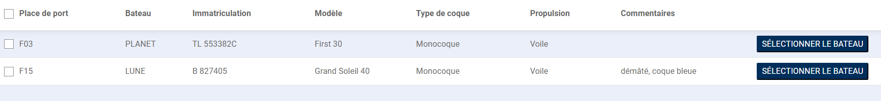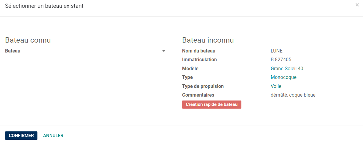Une fois le bateau identifié, cliquer sur Sélectionner le bateau et remplir le nom, ou créer le bateau, puis cliquer sur Confirmer.