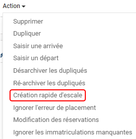 Il est possible de créer une escale directement depuis le module des déplacements. Ouvrir le déplacement concerné. Cliquer sur Action, Création rapide d'escale puis remplir les champs.