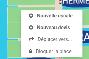 En faisant un clic droit sur une place, il est possible d'ajouter une nouvelle escale, de créer un nouveau devis, de bloquer la place... Si une place est bloquée, elle ne sera plus disponible à la réservation jusqu'au déblocage.