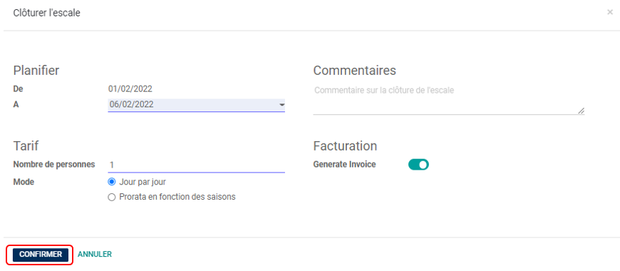 Rentrer la nouvelle date de fin et cliquer sur Marquer comme clôturée, puis choisir le type de facturation et cliquer sur Confirmer.