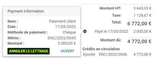 Pour délettrer une facture, cliquer sur le i puis sur Annuler le lettrage.
