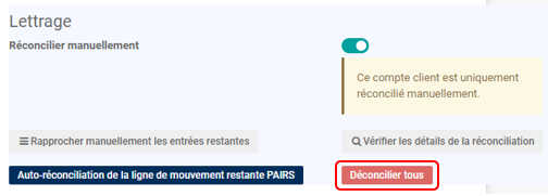 Pour délettrer le compte entier, cliquer sur Compte Client, activer le switch Réconcilier manuellement, puis sur Déconcilier tous.