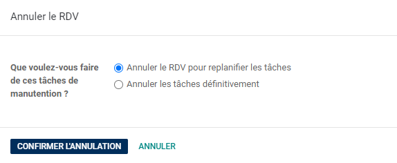 Si cette deuxième option est choisie, les tâches annulées seront reproposées lors de la prochaine prise de rendez-vous.