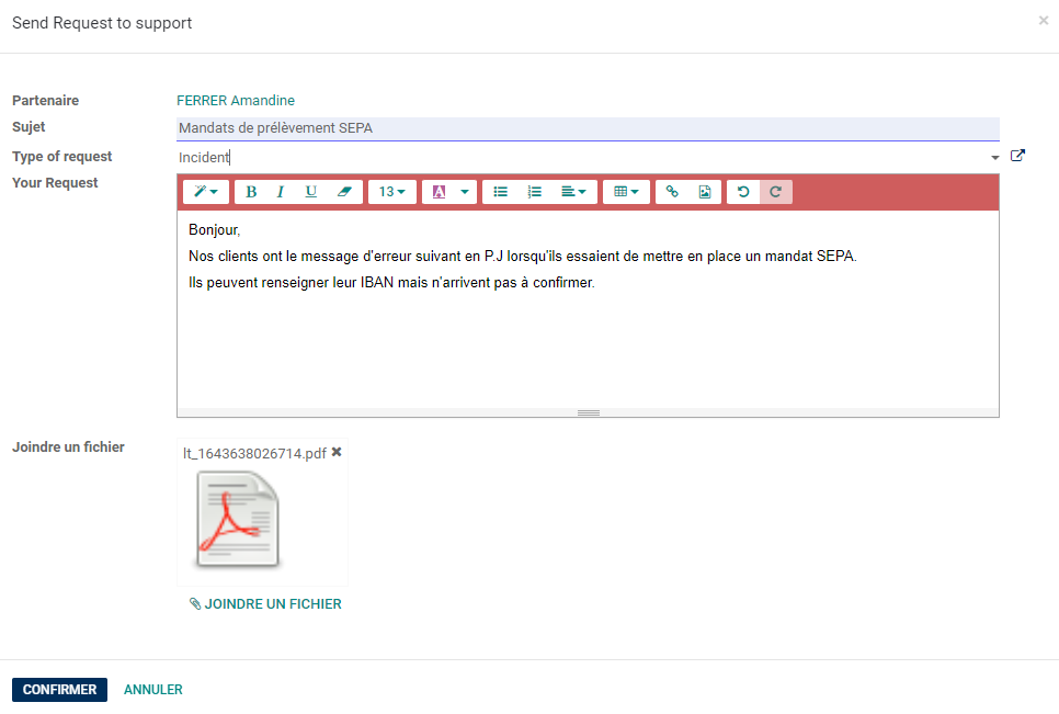 Renseigner le plus d'informations nécessaires, ajouter si besoin des P.J, puis cliquer sur Confirmer.