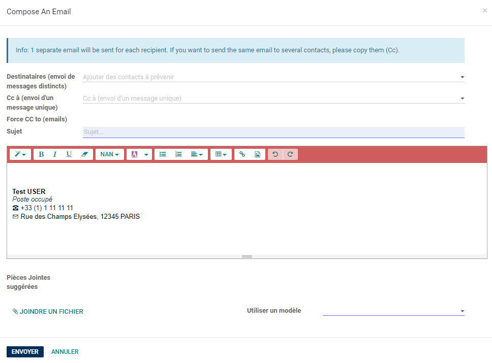 Renseigner le sujet, le corps du mail puis cliquer sur Envoyer. Il est également possible d'ajouter des pièces-jointes.