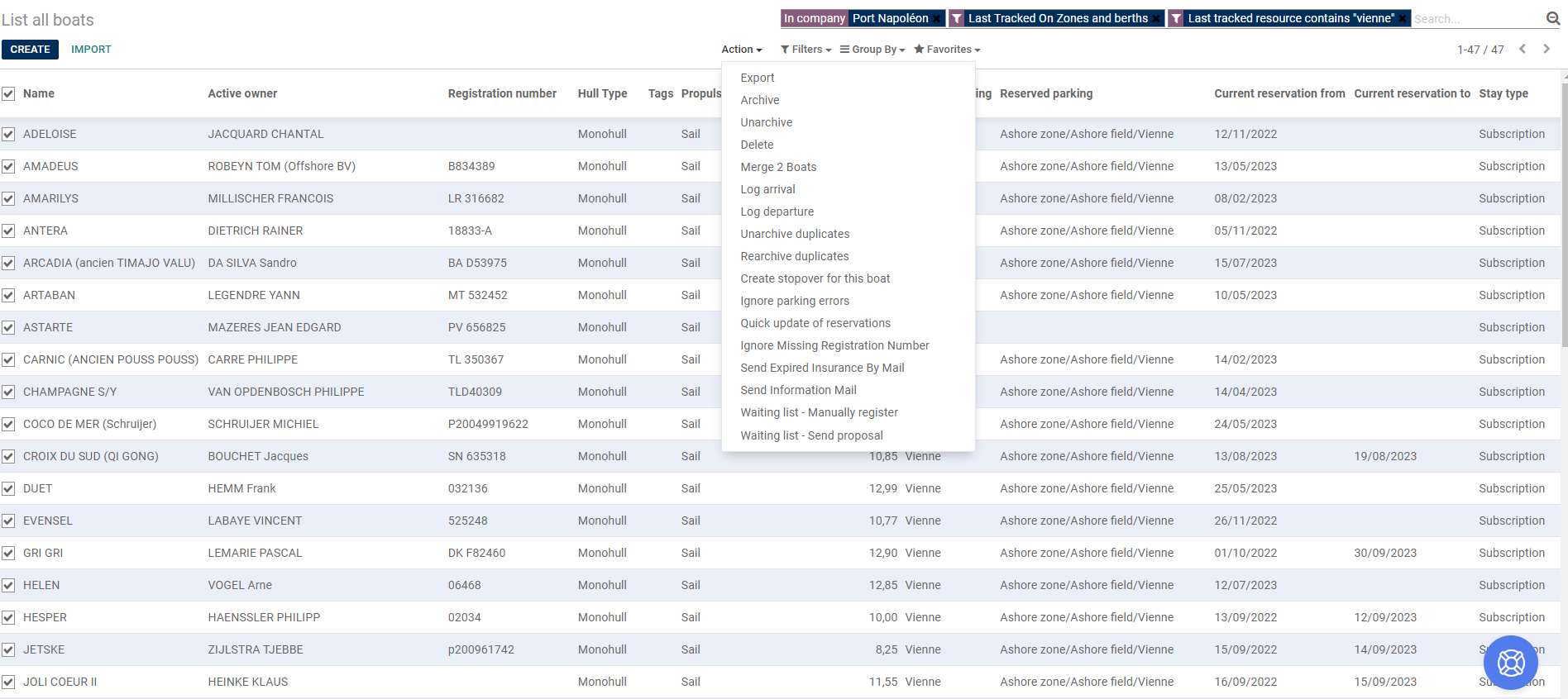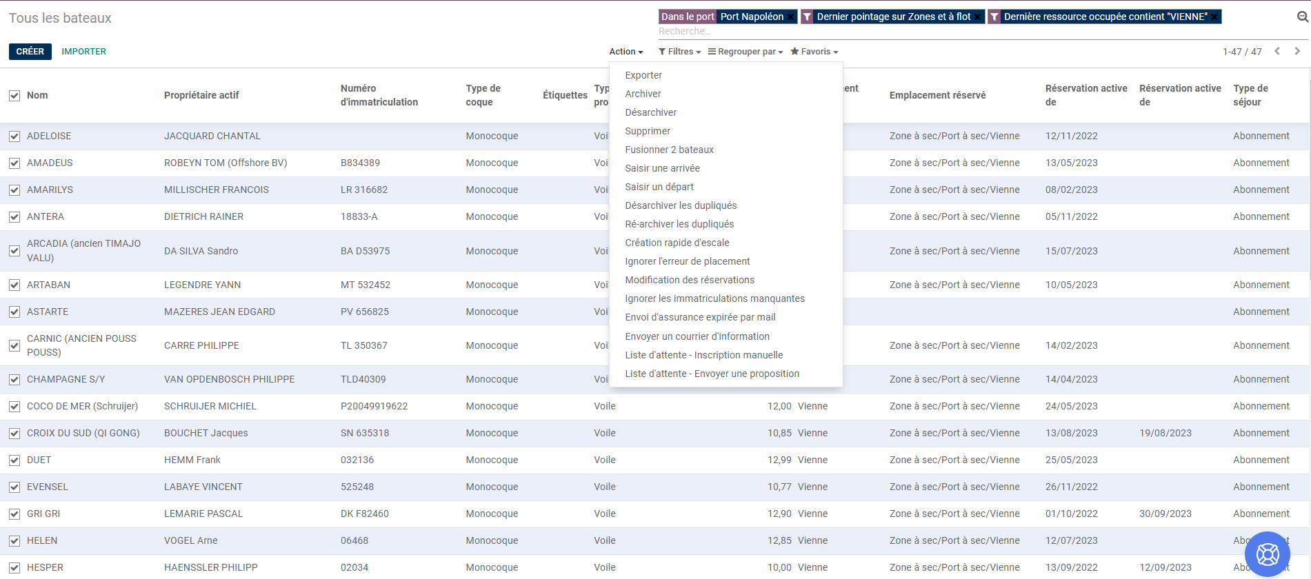 Sélectionner les bateaux, cliquer sur Action et Envoyer un courrier d'information :