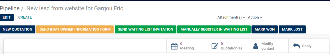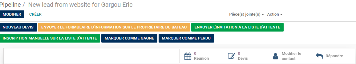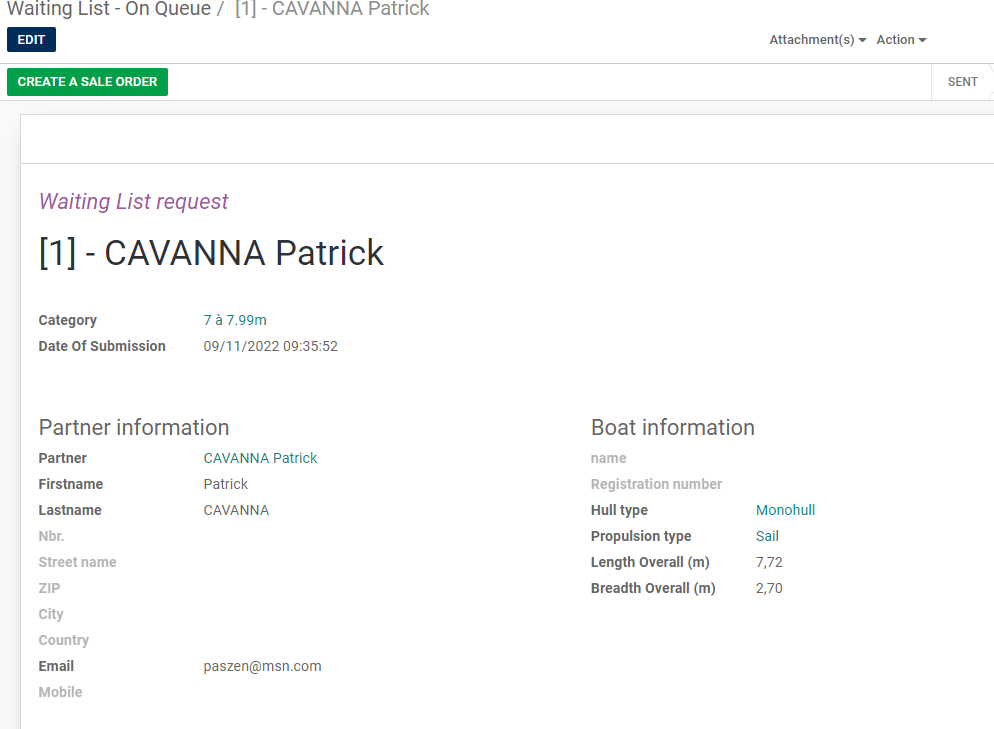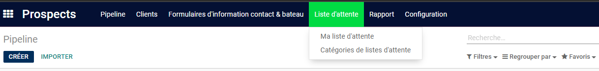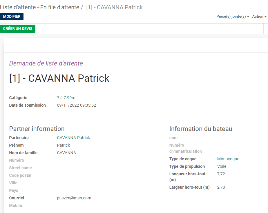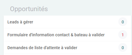 2.Envoi d'un mail d'invitation à la liste d'attente : Aller sur la demande du prospect et envoyer une demande d'inscription à la liste d'attente (comme le formulaire d'informations), à la validation du client, la demande apparait dans une nouvelle catégorie du Tableau de Bord : "Opportunités" / "Demandes de liste d'attente à valider". Lorsque la demande est validée par la capitainerie, le prospect reçoit un mail de confirmation.