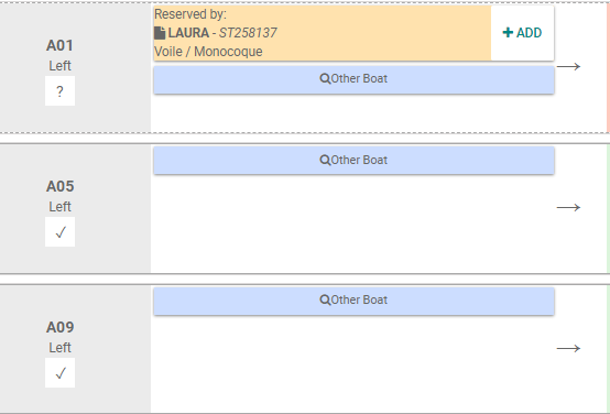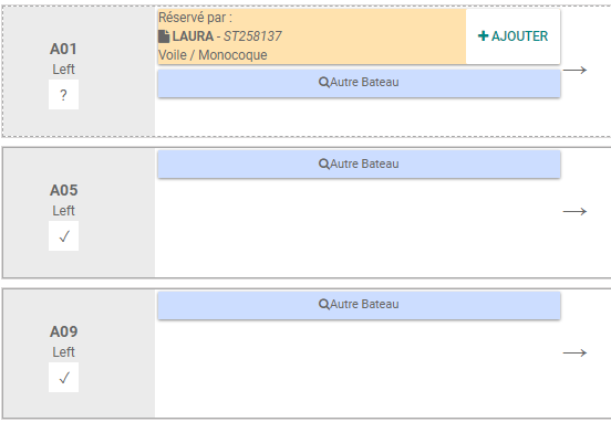- Deuxième colonne : Indique la réservation et le dernier bateau pointé s'il est différent de la réservation. Cliquer sur "+ Ajouter" pour sélectionner le bateau. Cliquer sur "Autre Bateau" pour choisir un autre bateau.