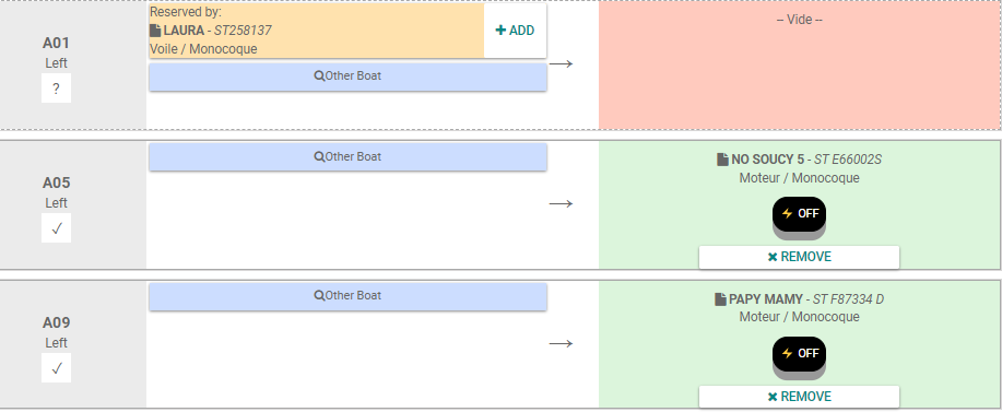 - Troisième colonne : Indique le bateau présent sur la place. Possibilité de switcher sur "OFF" si un bateau est branché. Possibilité de cliquer sur "X RETIRER" pour supprimer le bateau.