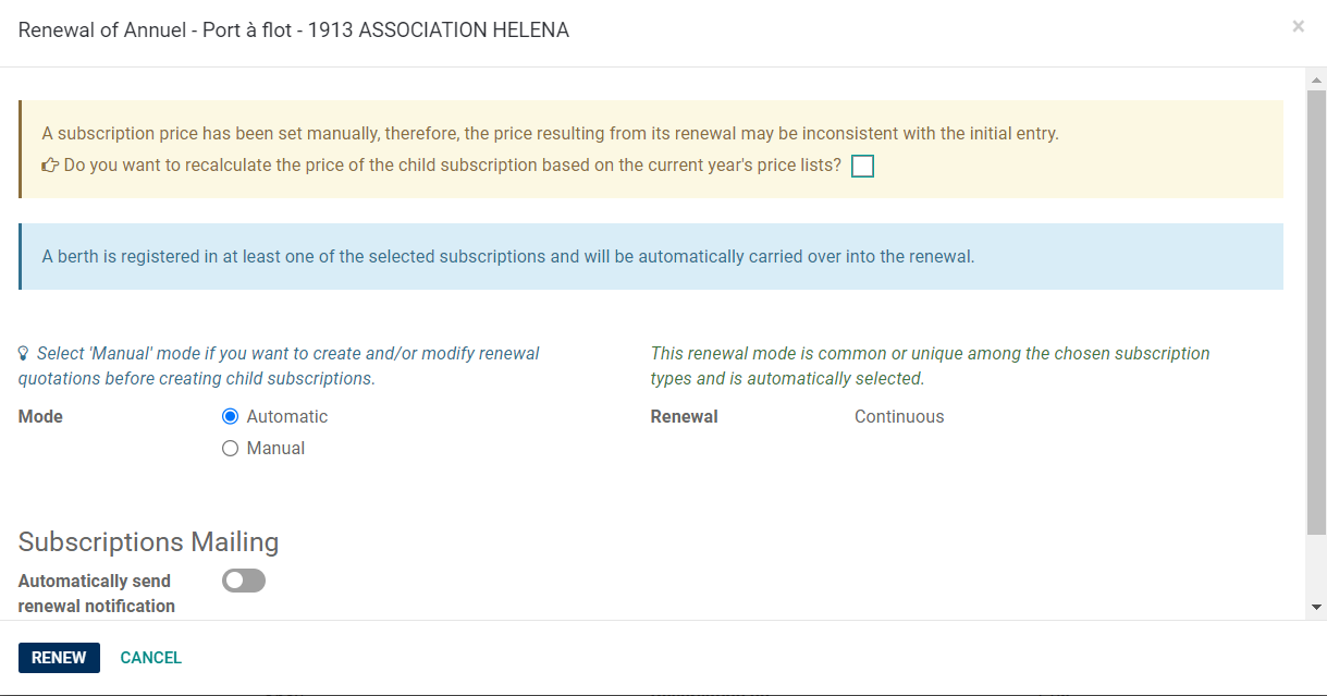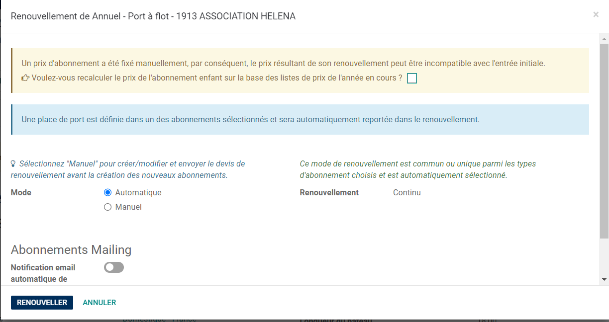 - Ajout d'une case à cocher dans un bandeau de renouvellement de contrat lorsqu'un prix avait été défini manuellement permettant de recalculer automatiquement les tarifs en fonction de l'année de renouvellement du nouveau contrat.