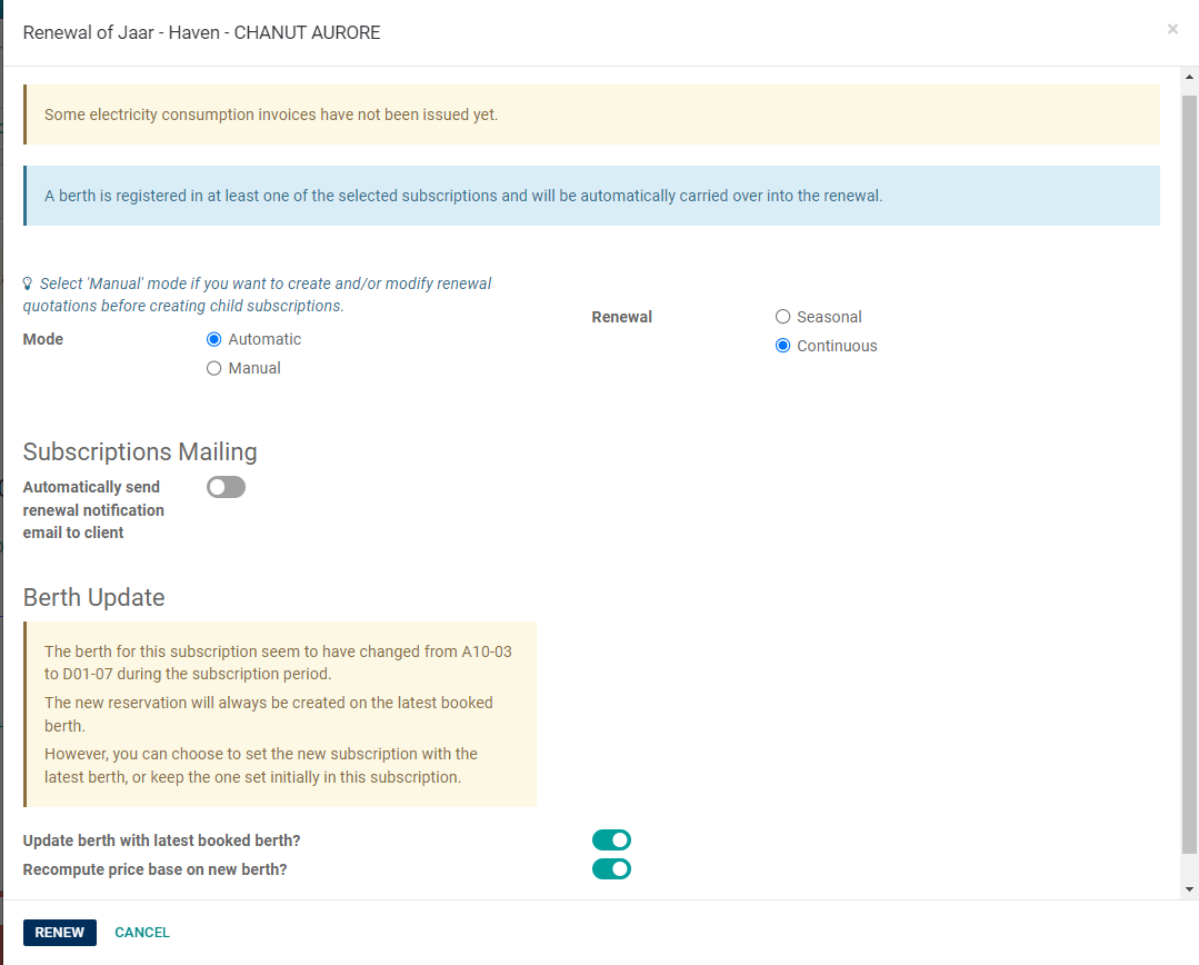 - 💡 NOUVEAUTE💡 : Lors d'un renouvellement, si la réservation a été modifiée sur le contrat parent, proposition de modifier la place sur le contrat enfant ainsi que la réservation. Si le prix dépend de la place, alors il est possible de recalculer le bon tarif en cliquant sur le bouton "Recalculer le prix sur la base de la nouvelle place réservée ?".