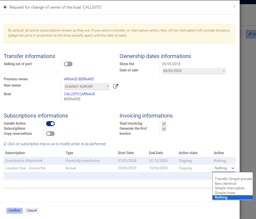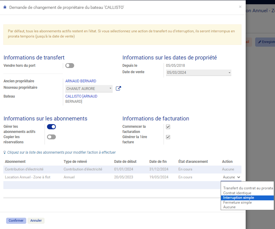 Lors d'une vente de bateau, il est désormais possible de gérer de façon indépendante les clôtures et transferts de contrats.