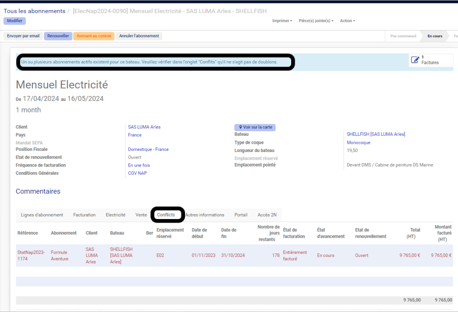- A la création d'un contrat si un autre contrat avec le même bateau est en cours, un bandeau et un nouvel onglet s'affichent.