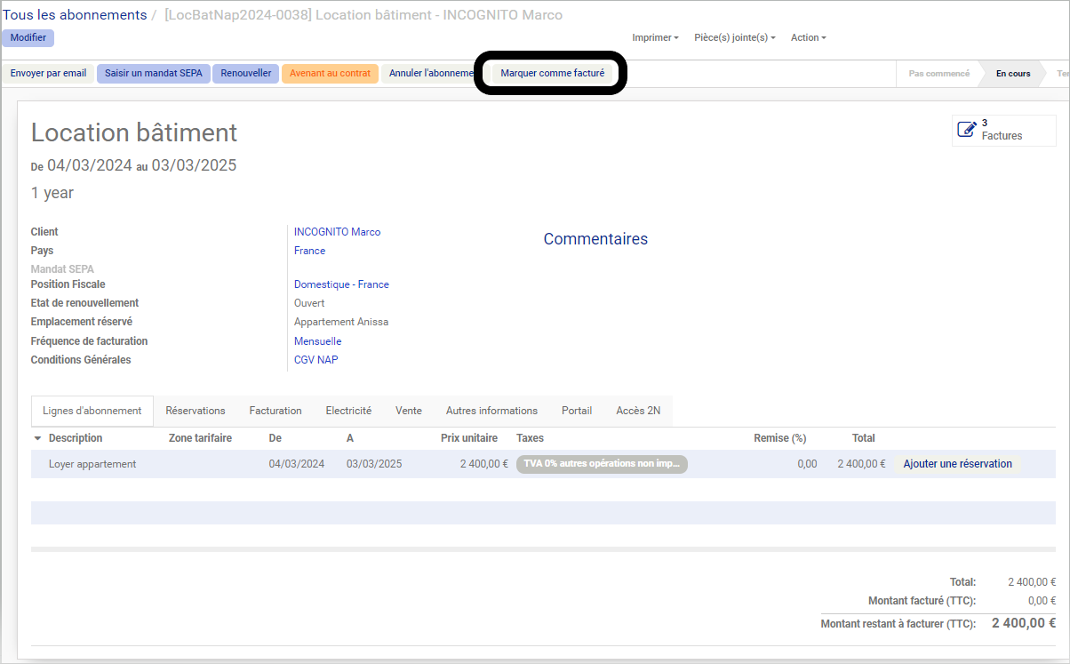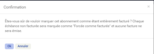 - Changement de place du bouton "Marquer comme facturé". Désormais il se trouve sur le contrat. Une confirmation est demandée avant de confirmer l'action.