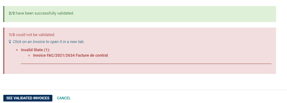 - Lors de la validation de factures brouillons, si une facture déjà validée est sélectionnée Vega ne bloquera plus la validation des autres et un bandeau de fin de procédure affichera le compte des factures qui ont été validées, et celles qui ne l'ont pas été.