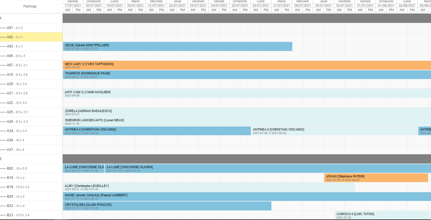 - Cases bleues claires : Emplacements vacants (places réservées mais non occupées, bateau en navigation par exemple) : possibilité aussi de créer une escale rapide en sélectionnant les dates voulues
