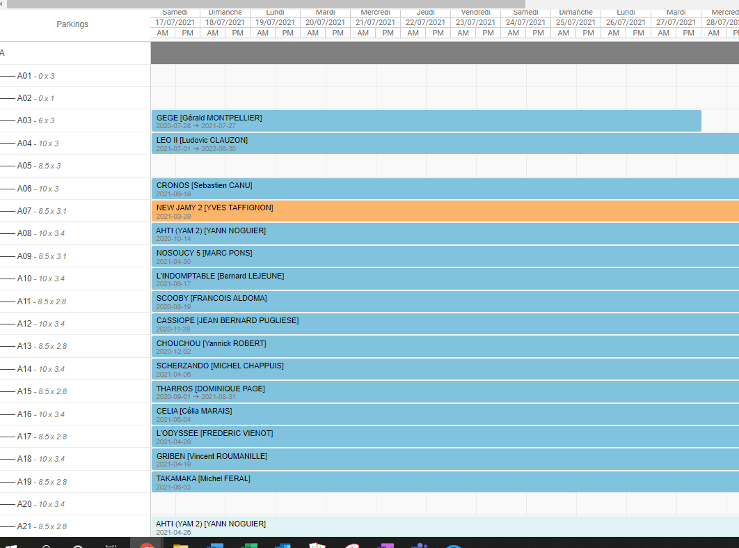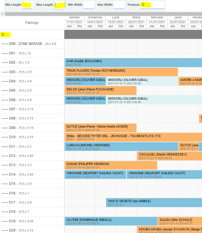 - Emplacements non visibles : Emplacements réservés par des contrats longues durées. Pour obtenir la vue complète : Aller dans l'application Port/Vente/Full Reservation & Stopovers Planning