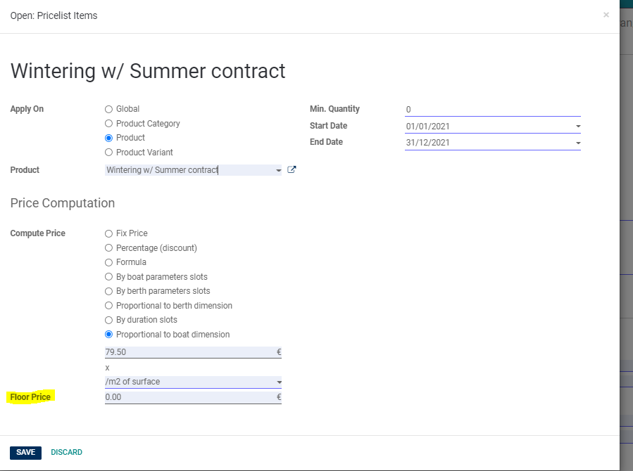- Ajout d'un champ pour définir un prix minimum pour les listes de prix déterminées par la longueur au m2 du bateau ou de la place. (NAARDEN - contrat hiver par exemple)