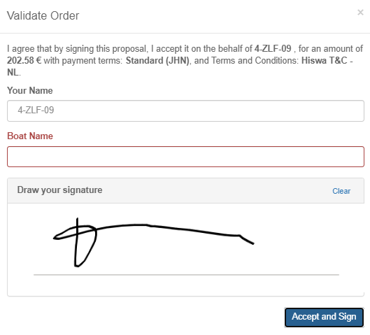 Après avoir signé le devis, le client a l'obligation de remplir le champ "Nom de bateau".