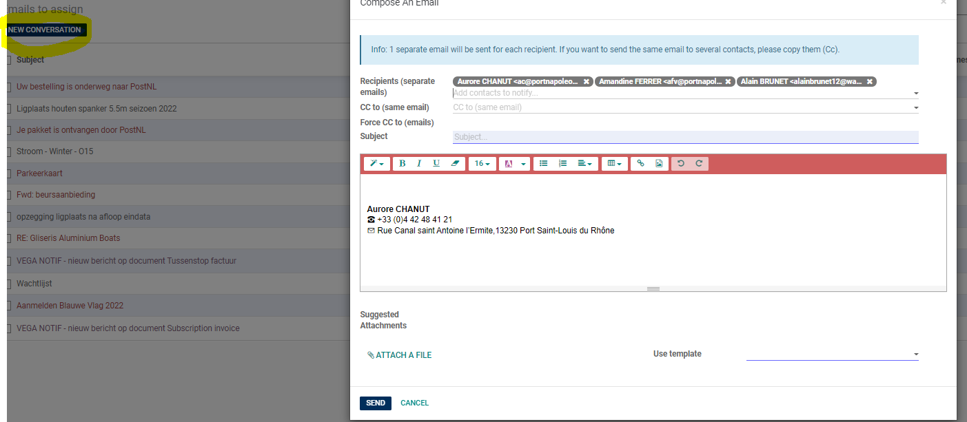 - Possibilité de créer une nouvelle conversation email et d'y ajouter plusieurs clients en destinataire.