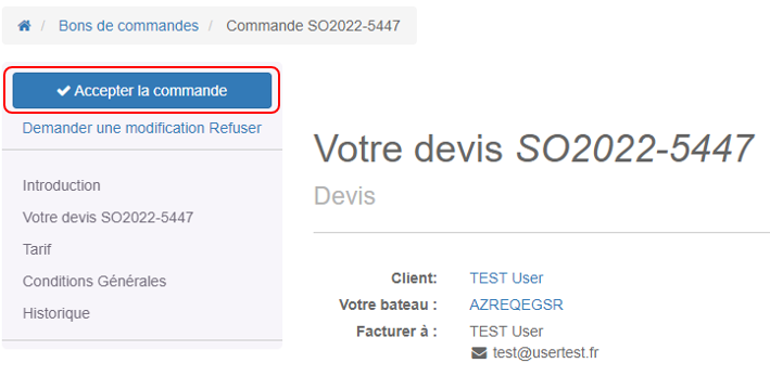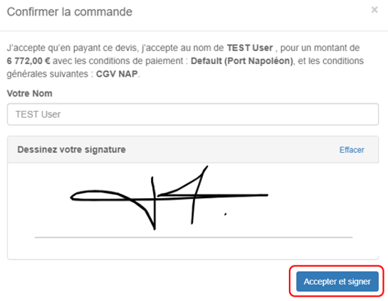 Il arrive sur le portail client et clique sur Accepter la commande, puis dessine sa signature et clique sur Accepter et signer.