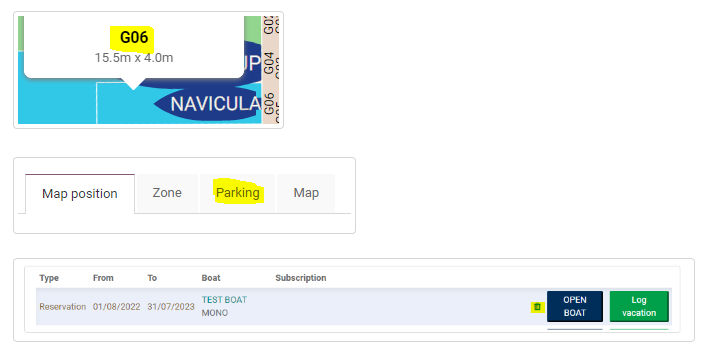 Il est également possible d'annuler une option directement depuis la carte du port. Pour cela, cliquer sur la place en question et ouvrir l'onglet de stationnement, puis cliquer sur la petite poubelle.