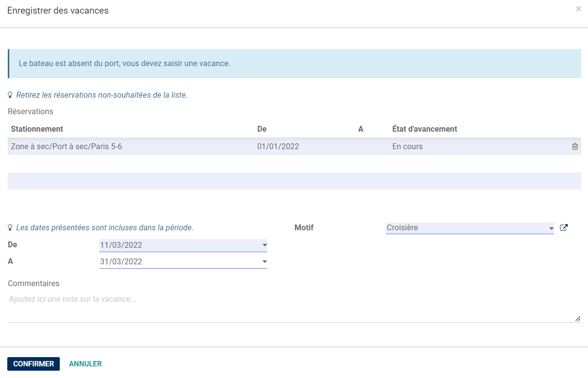 Renseigner les dates, le motif puis cliquer sur Confirmer.